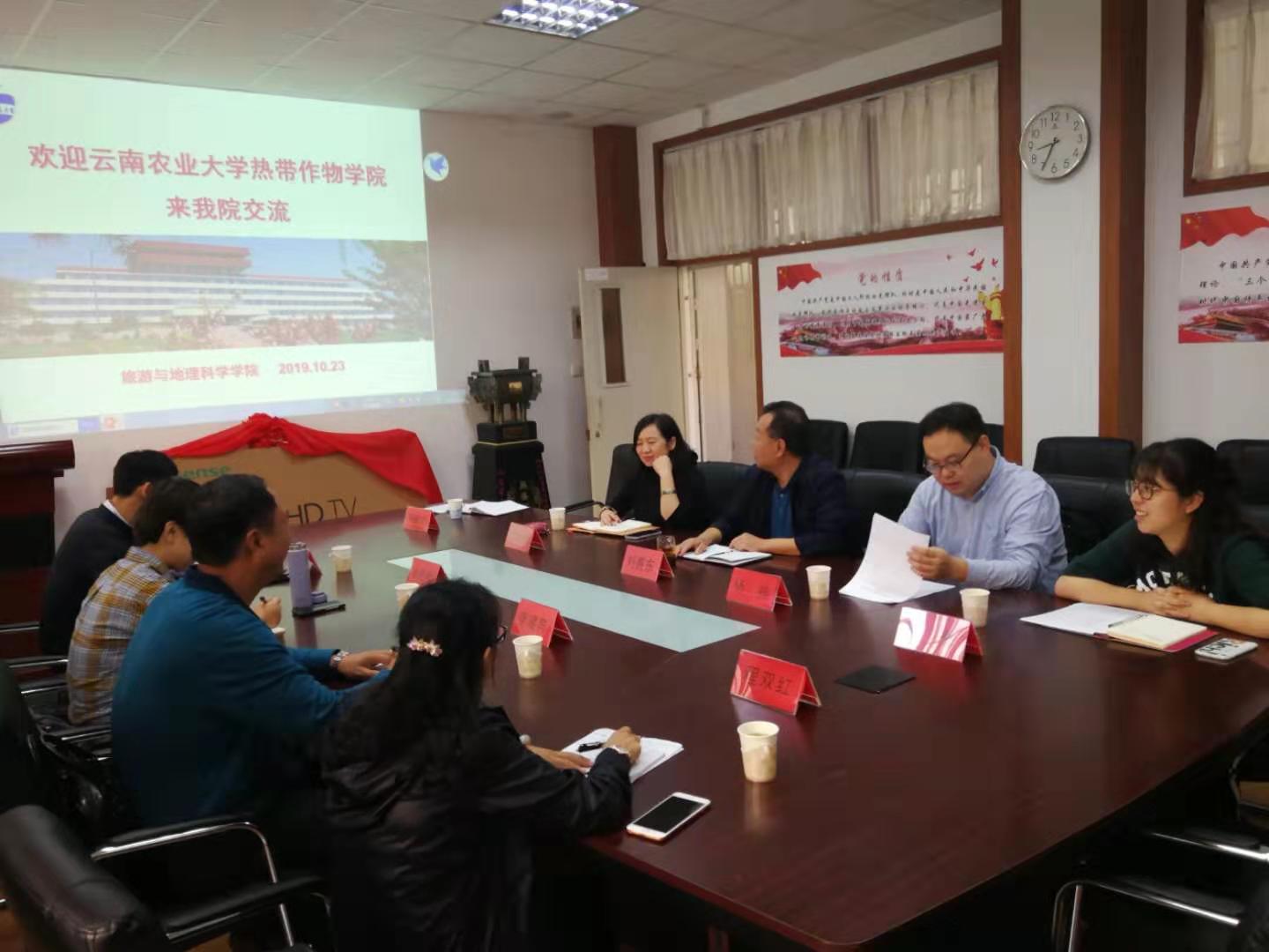 2019年10月23日,云南农业大学热带作物学院院长李建宾带领旅游专业系主任、教科办主任、骨干教师一行四人到我院考察交流;我院刘善东书记、教科办主任蒋敏之、于岩平副教授、学工办副主任杨秀等在学院会议室进行了交流。双方就各自学院的基本概况和整体办学情况进行了介绍;我院重点在人才培养方案、人才培养规格、3+2贯通班等方面进行了解读。通过此次交流双方在招生、专业设置、课程规划、就业等方面有了更加全面的了解,为以后的合作交流奠定了基础。