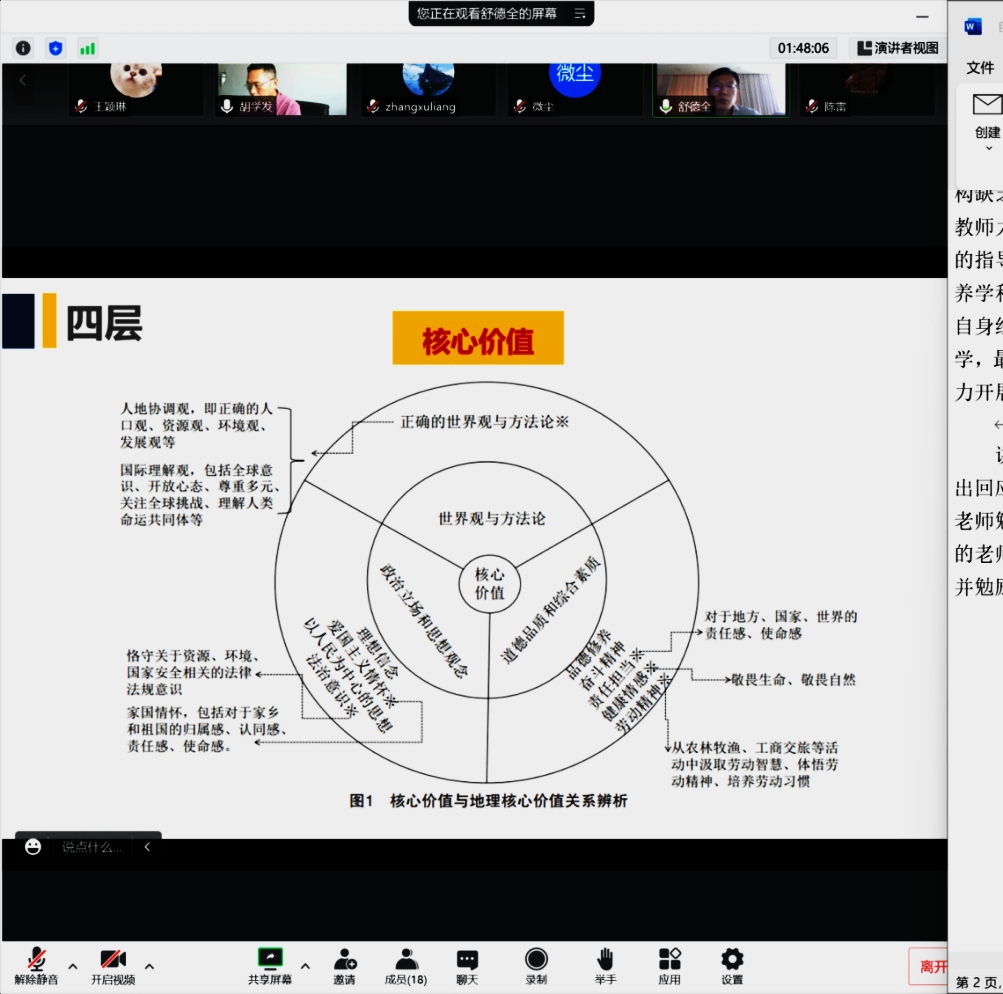 舒老师还从“考什么、为什么考、怎么考”3方面,详细分析了一核和四层四翼的内容,其中强调了四层的核心价值,并对核心价值与地理核心价值关系进行辨析,强调了观念的重要性。