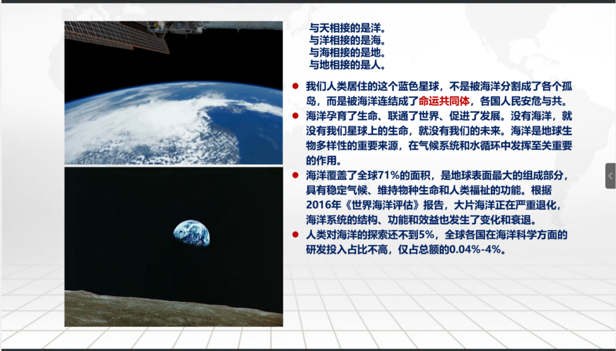胡老师利用各种海洋生态图片,介绍了海洋垃圾的危害性、海洋生态爆发产生的赤潮类型、海洋常见的石油污染、噪音污染以及海洋物种病变和锐减等现象。