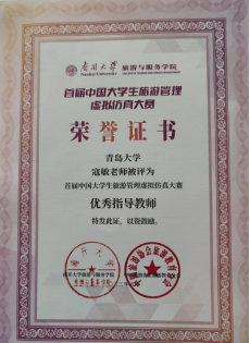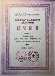 2023年5月25日—28日,由中国旅游协会旅游教育分会和南开大学旅游与服务学院联合主办,天津新旅科技有限公司承办的首届中国大学生旅游管理虚拟仿真大赛决赛在南开大学旅游与服务学院成功举办。由我院寇敏、刘鸣老师指导,2021级旅游管理专业余敏芳、钏晓梅、刘婷、邓涵菲组成的参赛队伍,经过预赛、复赛、决赛三轮的激烈角逐,最终获得全国二等奖的优异成绩,寇敏老师获优秀指导教师奖。
