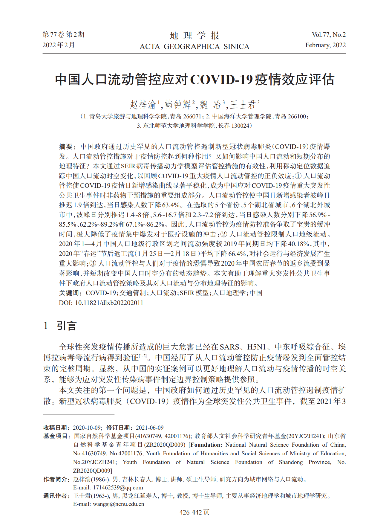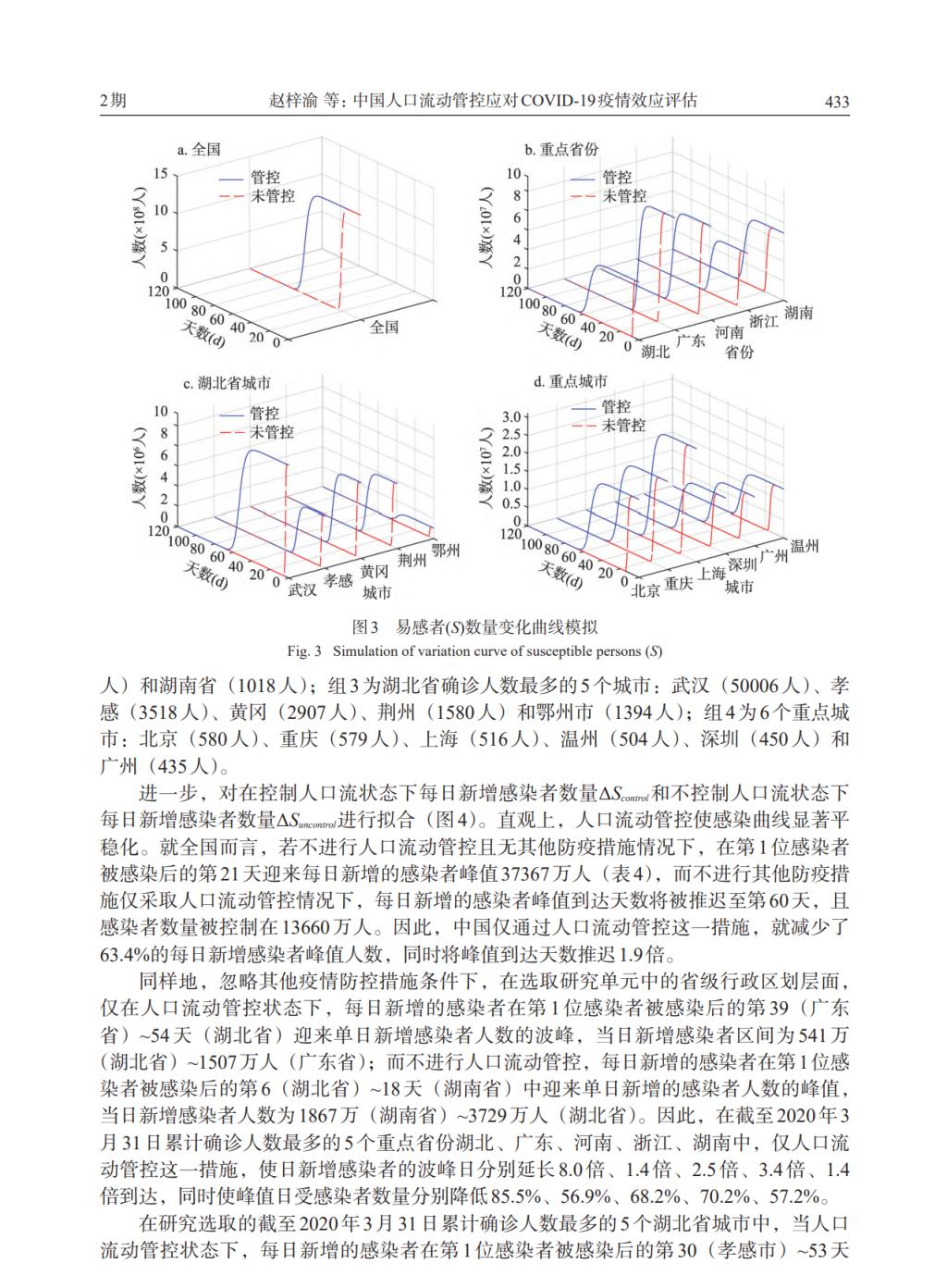 立足中国国民社会经济发展重大事件研究的现实需求,我院青年教师赵梓渝在2022年第2期《地理学报》发表论文《中国人口流动管控应对COVID-19疫情效应评估》。新型冠状病毒肺炎(COVID-19)疫情作为全球突发性公共卫生事件,中国政府通过历史罕见的人口流动管控遏制新型冠状病毒肺炎(COVID-19)疫情爆发。人口流动管控措施对于疫情防控起到何种作用?又如何影响中国人口流动和短期分布的地理特征?论文通过SEIR病毒传播动力学模型评估管控措施的有效性,利用移动定位数据追踪中国人口流动时空变化,以回顾COVID-19重大疫情人口流动管控的正负效应。研究发现:①人口流动管控使COVID-19疫情日新增感染曲线显著平稳化,成为中国应对COVID-19疫情重大突发性公共卫生事件时非药物干预措施的重要组成部分。人口流动管控使中国日新增感染者波峰日推迟1.9倍到达,当日感染人数下降63.4%。在选取的5个省份、5个湖北省城市、6个湖北外城市中,波峰日分别推迟1.4~8倍、5.6~16.7倍和2.3~7.2倍到达,当日感染人数分别下降56.9%~85.5%、62.2%~89.2%和67.1%~86.2%。因此,人口流动管控为疫情防控准备争取了宝贵的缓冲时间,极大降低了疫情集中爆发对于医疗设施的冲击;②人口流动管控限制人口地级流动。2020年1—4月中国人口地级行政区划之间流动强度较2019年同期日均下降40.18%,其中,2020年“春运”节后返工流(1月25日—2月18日)平均下降66.4%,对社会运行与经济发展产生重大影响;③人口流动管控与人们对于疫情的恐惧导致2020年中国农历春节的返乡流受到显著影响,并短期改变中国人口时空分布的动态趋势。论文有助于理解重大突发性公共卫生事件下政府人口流动管控策略及其对人口流动与分布地理特征的影响