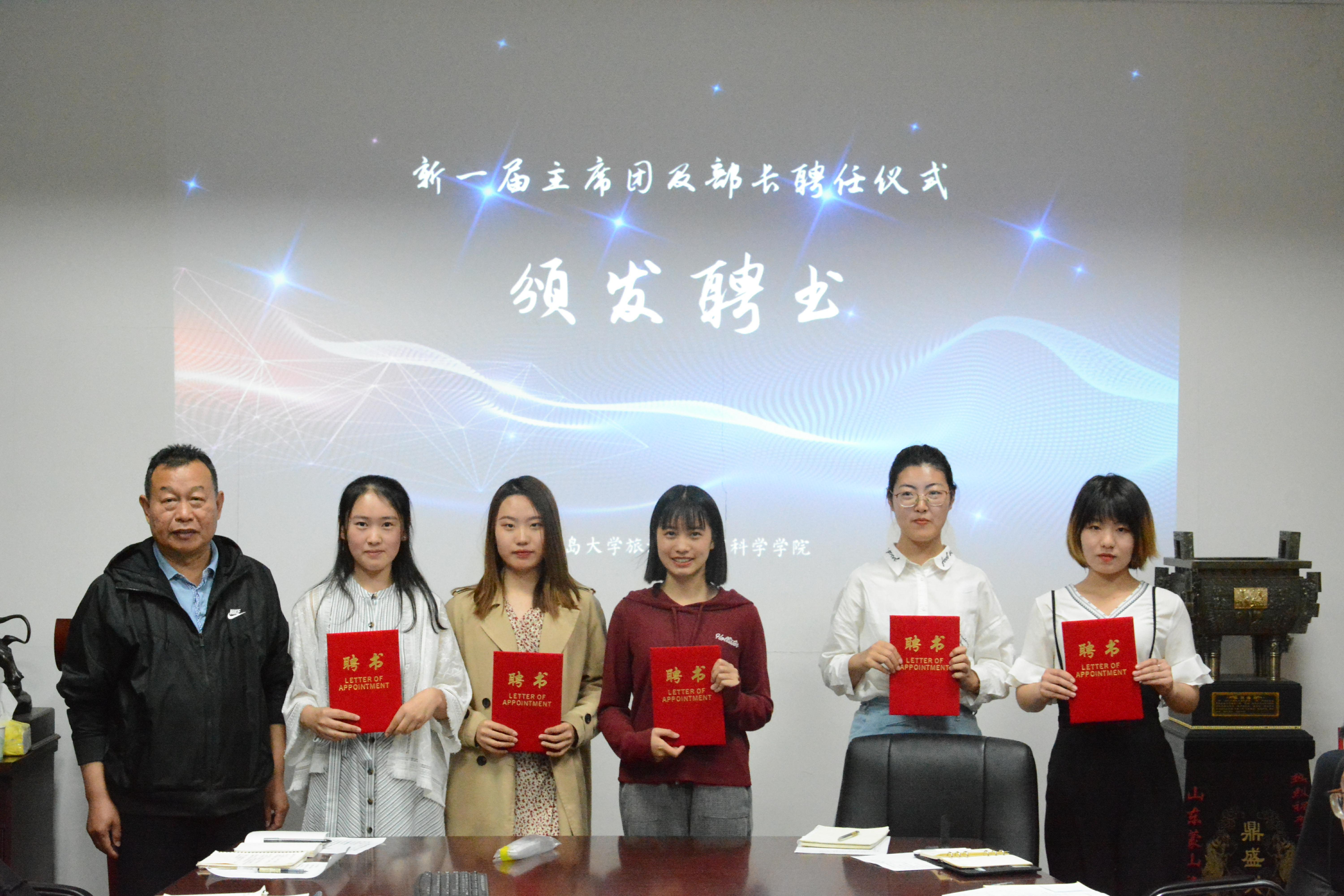 5月20日晚,SJB世俱杯官方网站新一届学生会主席团及部长聘任仪式于SJB世俱杯官方网站浮山校区睿思楼122室举行。SJB世俱杯官方网站党委书记刘善东及辅导员老师出席本次活动。