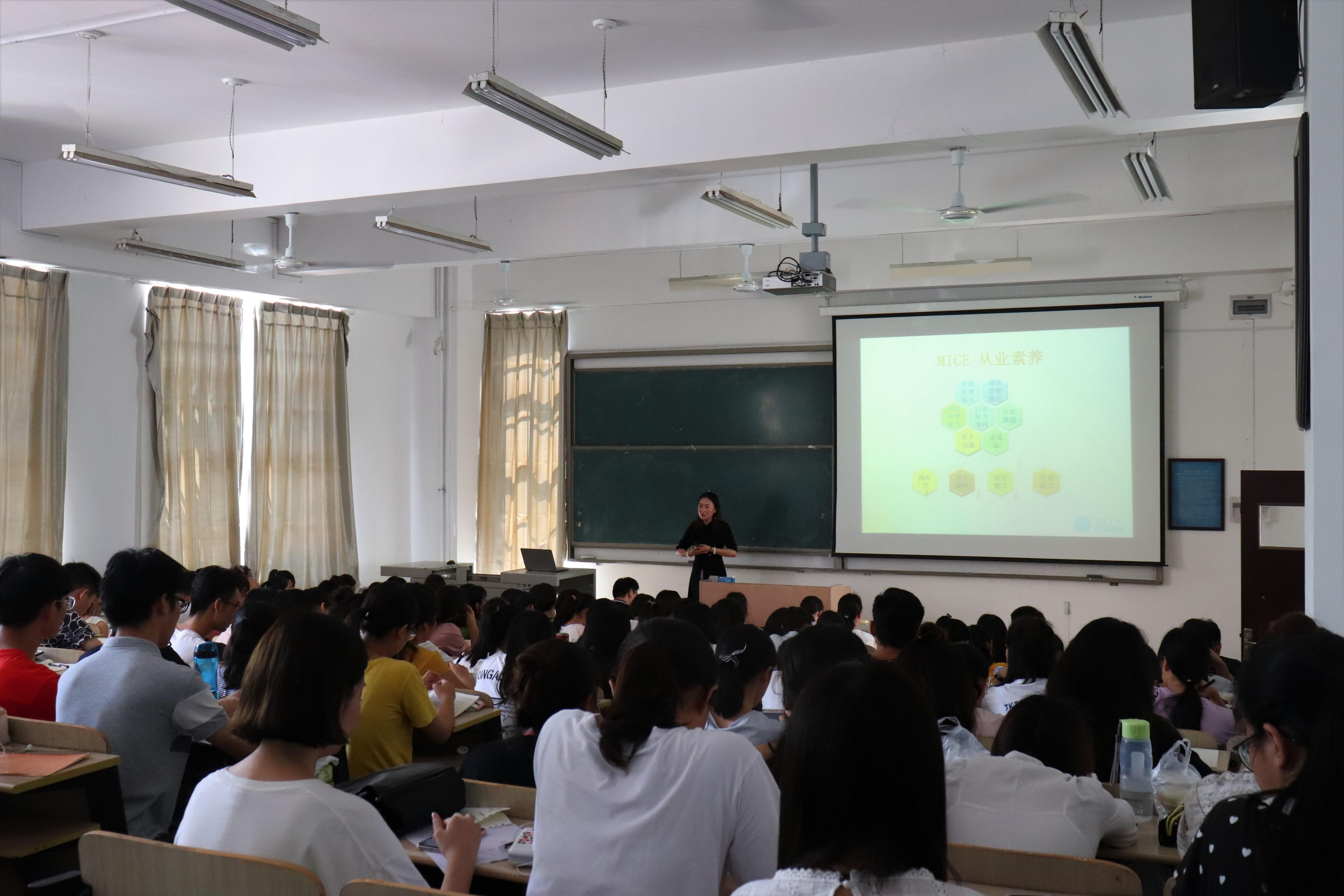 首先,李辉女士向同学们介绍了MICE行业,即Meetings(会议)、Incentives(奖励旅游)、Conferencing/Conventions(大型企业会议)、Exhibitions/Exposition(活动展览)和Event(节事活动)。她从“什么是MICE”“MICE行业划分”“MICE的客户需求”等方面详细阐述了MICE行业的源起、发展、现状以及其从业者的工作内容。随后,李辉女士从MICE行业的从业素质角度切入,给出了未来同学们步入社会的建议:在自我发展的前期要能承受住委屈,同时要努力成为一个有阅历、有谈资的人。最后,她因地制宜,分析了青岛地区的MICE市场前景,得出结论青岛在MICE行业具有很大的潜力。