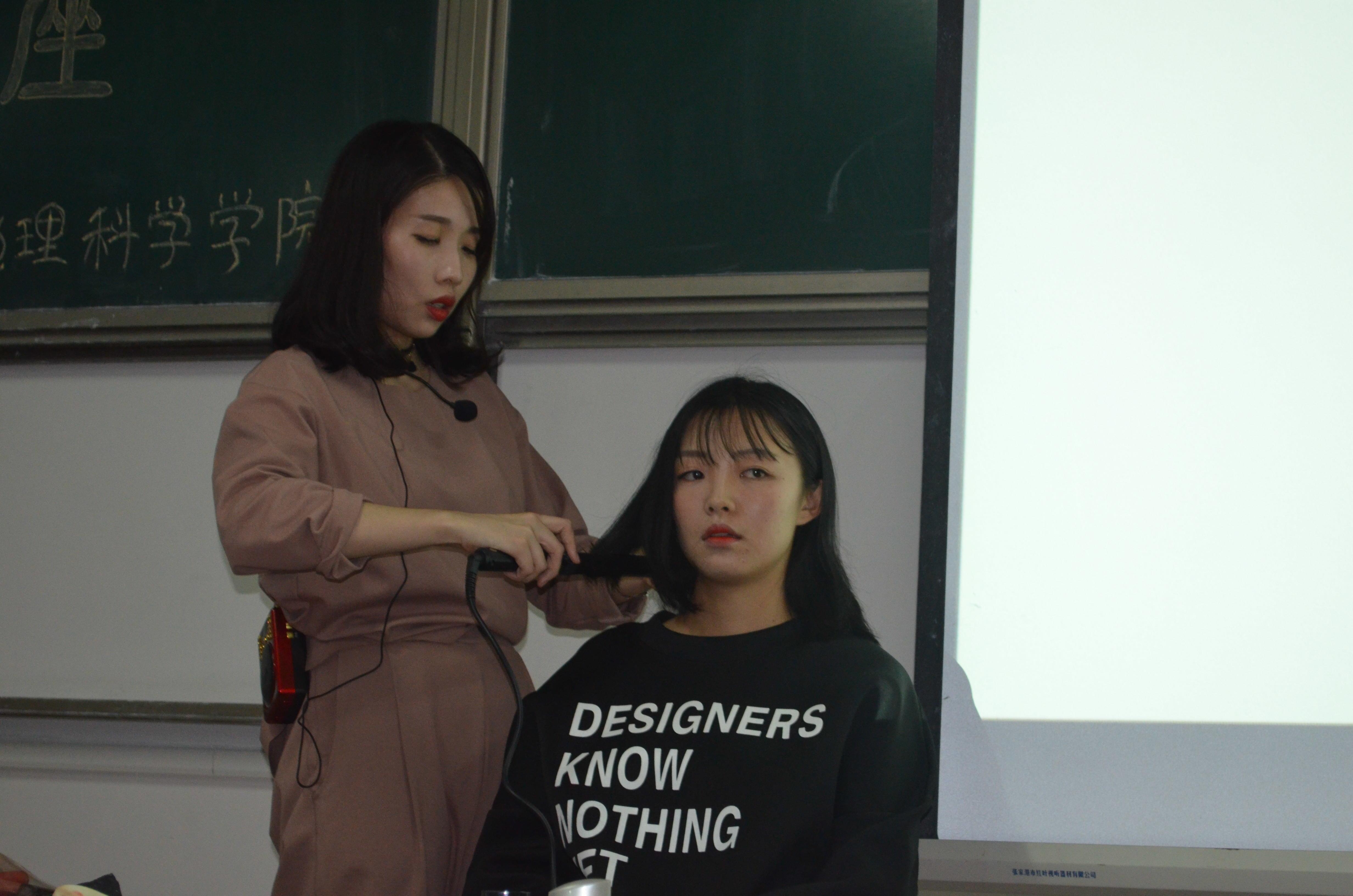 在讲座中,化妆师金晨首先为大家示范了半面妆的化妆技巧,并通过演示纠正了同学们的化妆错误;随后,金晨老师为大家教授了一些面试和搭配的技巧,并就化妆品的选择和适用肤质类型为同学提出建议;最后,金晨老师及其团队与同学们进行现场互动并对同学们提出的化妆与搭配问题进行解答。