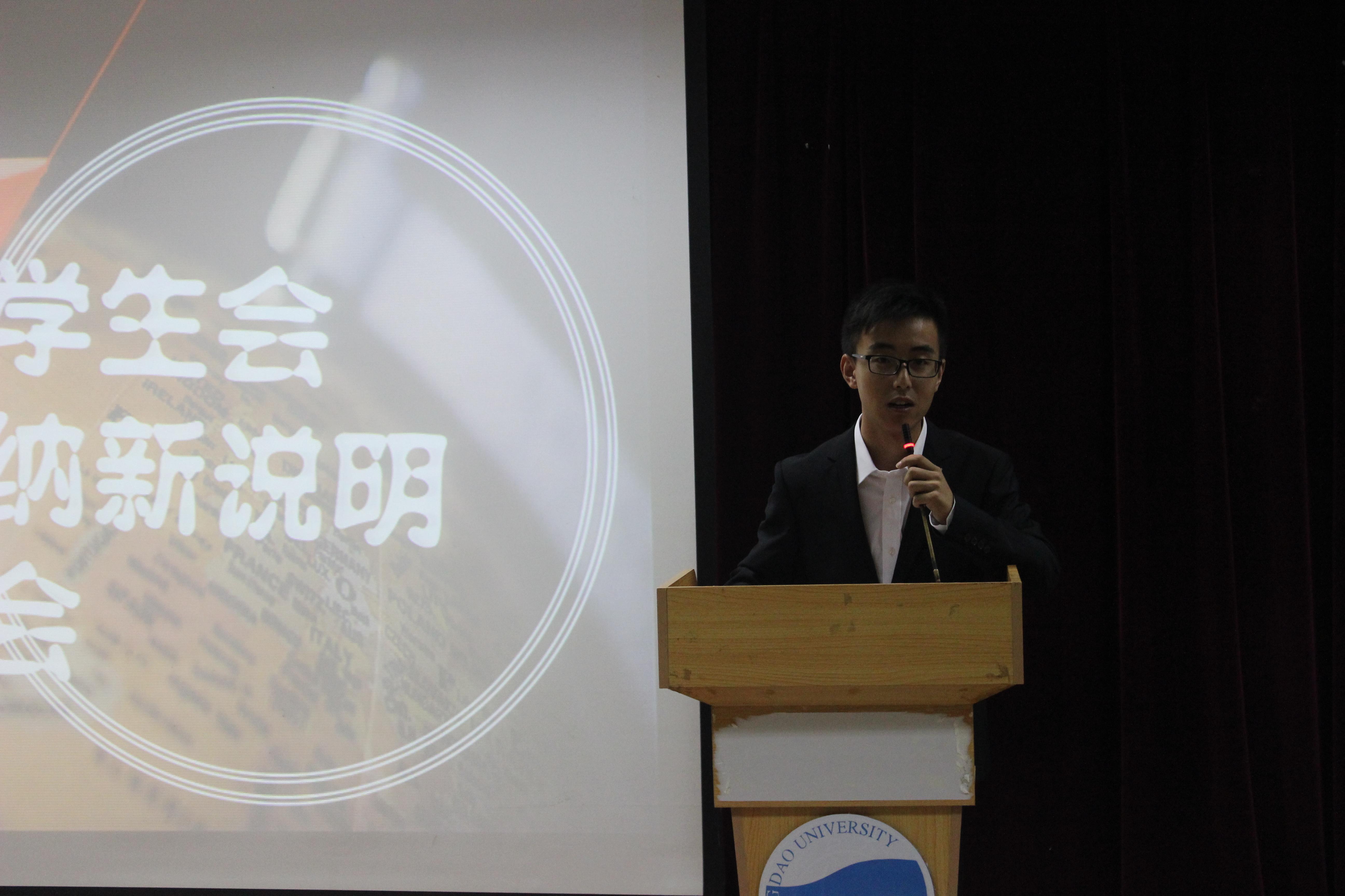 在主持人对本次说明会进行简单介绍之后,说明会正式开始。首先,学生会主席邱天斌代表主席团致开场词,并对新生表达了真切期盼,希望大家增强责任感,稳重干事并富有情怀。随后,各部门在分管主席的带领下就部门工作内容、特色活动、部门成就等方面为新生进行介绍。