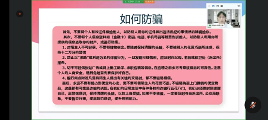 宣讲人为学生们介绍包括网上兼职诈骗在内的等针对在校大学生的新型诈骗方式,通过讲述真实诈骗事件和具体的数据,说明了诈骗的危害性之大,渗透性之强。在具体分析事例的同时,宣讲人提出了许多预防被诈骗的建议,强调一定要有安全意识,保护好个人安全,希望同学们意识到诈骗的无处不在,加强防范意识。接下来,宣讲人以宿舍、实验室着火为案例,提出四条防火安全措施,同时对学生宿舍、教室、实验室、图书室、食堂等学生活动密集场所说明详细的防火要求和自救措施。与此同时,宣讲人以图文结合的形式介绍灭火器以及消火栓的使用方法,确保同学们在火灾发生时,能够尽力的实现保护与自救。