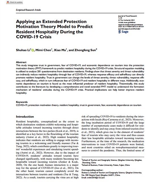 近日,学院李书昊博士研究团队在旅游管理领域国际公认的三大顶级期刊之一《Journal of Travel Research》(SSCI一区, ABS 4星期刊)发表题为“Applying an Extended Protection Motivation Theory Model to Predict Resident Hospitality during the COVID-19 Crisis”的研究成果,实现了我院在旅游管理领域国际三大顶刊以及ABS 4星期刊发表论文的首次突破。李书昊博士为论文第一作者兼通讯作者,SJB世俱杯官方网站为论文第一作者及通讯作者单位。