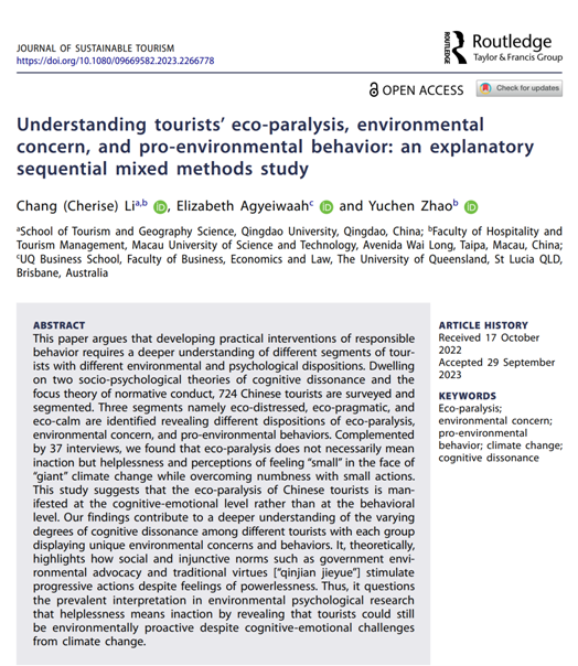 近日,学院李畅博士团队在旅游管理领域国际公认的顶级期刊《Journal of Sustainable Tourism》(SSCI一区, ABS 3星期刊)发表题为“Understanding tourists’ eco-paralysis,environmental concern, and pro-environmentalbehavior: an explanatory sequential mixedmethods study”的研究成果。李畅博士为论文第一作者,SJB世俱杯官方网站为论文第一署名单位。