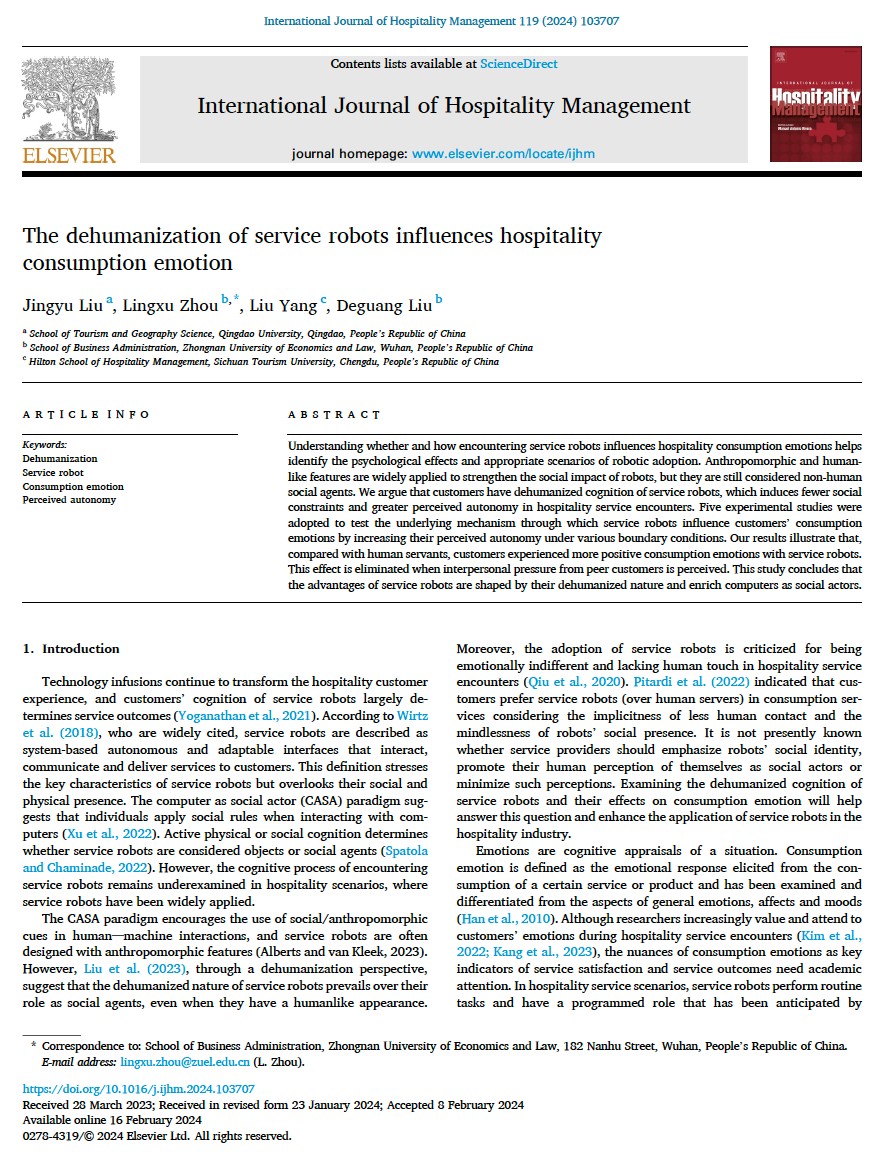 近日,SJB世俱杯官方网站刘晶瑜博士在International Journal of Hospitality Management上发表“The dehumanization of service robots influences hospitality consumption emotion”的研究成果。International Journal of Hospitality Management是JCR管理学一区、旅游与休闲管理一区期刊,最新影响因子为11.7。刘晶瑜博士是论文的第一作者,SJB世俱杯官方网站为论文的第一署名单位。