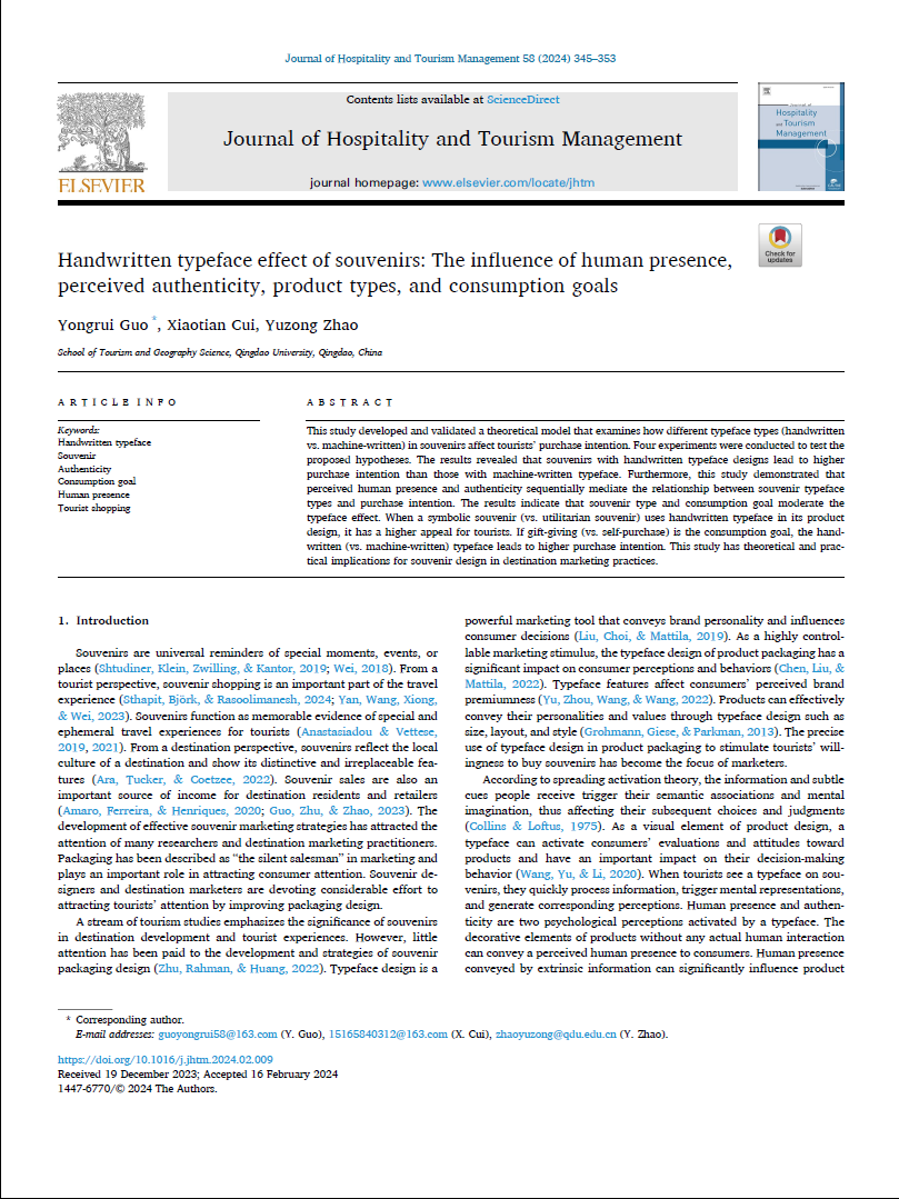 近日,SJB世俱杯官方网站郭永锐教授和赵玉宗教授团队在国际权威旅游期刊Journal of Hospitality and Tourism Management在线发表了题为“Handwritten typeface effect of souvenirs: The influence of human presence, perceived authenticity, product types, and consumption goals”的最新研究成果。Journal of Hospitality and Tourism Management最新影响因子为8.3,JCR旅游类和管理类一区权威期刊。郭永锐教授为论文的第一作者和通讯作者。SJB世俱杯官方网站是论文的唯一作者单位和通讯单位。该研究得到国家自然科学基金项目(41871126)、国家社会科学基金项目(19BJY215)和山东省社科规划项目(22CGLJ08)的共同资助。