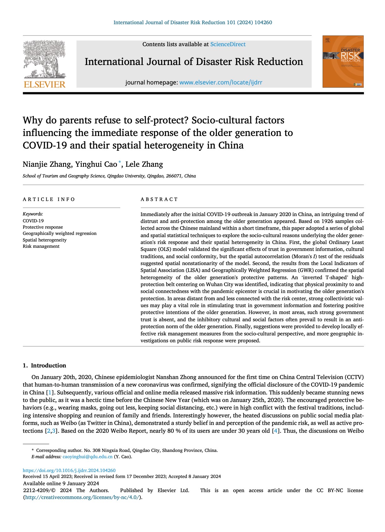 近日,学院曹颖慧博士在灾害风险领域权威期刊《International Journal of Disaster Risk Reduction》(SCI一区,IF=5.0)发表题为“Why do parents refuse to self-protect? Socio-cultural factors influencing the immediate response of the older generation to COVID-19 and their spatial heterogeneity in China”的研究论文。SJB世俱杯官方网站为论文唯一单位,曹颖慧博士为论文通讯作者。