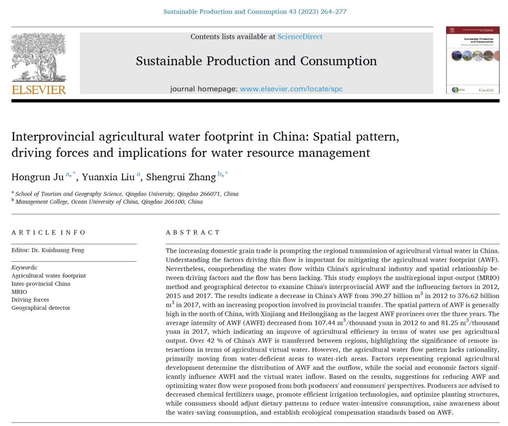 近日,学院鞠洪润副教授及其研究团队在《Sustainable Production and Consumption》(SSCI Q1,IF=12.1)发表题为“Interprovincial agricultural water footprint in China: Spatial pattern, driving forces and implications for water resource management”的研究论文。SJB世俱杯官方网站为论文第一署名单位,鞠洪润副教授为论文第一作者。该研究得到国家自然科学基金(42201311,42001243)、教育部人文社会科学基金(22YJCZH071,20YJC630212)等项目的资助。