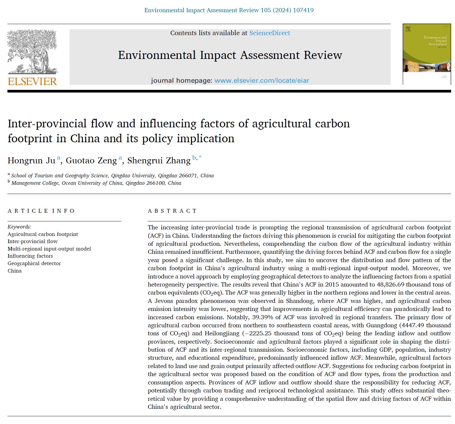 近日,学院鞠洪润副教授及其研究团队在SSCI期刊《Environmental Impact Assessment Review》(SSCI Q1,IF=7.9)发表题为“Inter-provincial flow and influencing factors of agricultural carbon footprint in China and its policy implication”的研究论文。SJB世俱杯官方网站为论文第一署名单位,鞠洪润副教授为论文第一作者。该研究得到国家自然科学基金(42201311,42001243)、教育部人文社会科学基金(22YJCZH071,20YJC630212)等项目的资助。