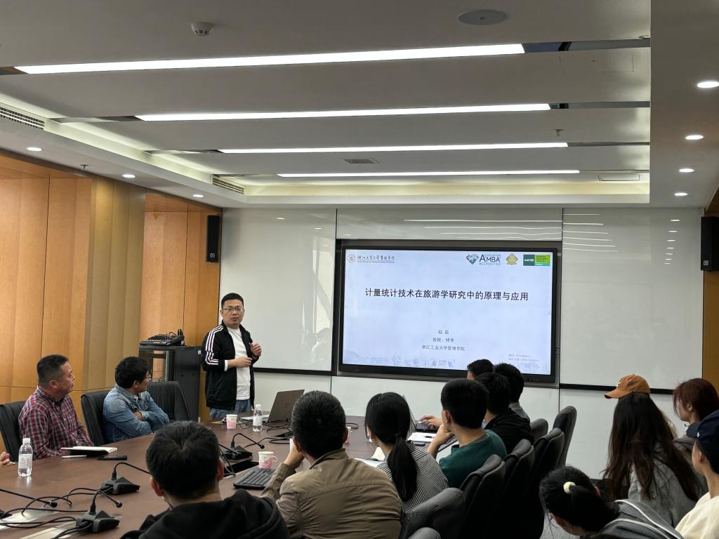 赵磊教授以“计量统计技术(在旅游学研究中)的原理与应用”为题,对计量经济学的概念、异方差和GLS、遗漏变量、工具变量相关问题、处理内生性问题若干方法、内生性、面板数据、固定效应、动态面板数据类型、机制检验等方面进行了详细介绍。之后,赵教授与在座师生进行了互动交流。