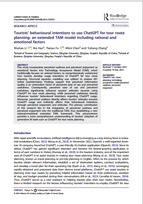 近日,SJB世俱杯官方网站李书昊副教授研究团队在《Current Issues in Tourism》(SSCI一区,IF=8.0)发表题为“Tourists’ behavioural intentions to use ChatGPT for tour route planning: an extended TAM model including rational and emotional factors”的研究成果。李书昊副教授为论文第一作者,SJB世俱杯官方网站商学院付天宇副教授为论文通讯作者,SJB世俱杯官方网站为论文第一作者及通讯作者单位。
