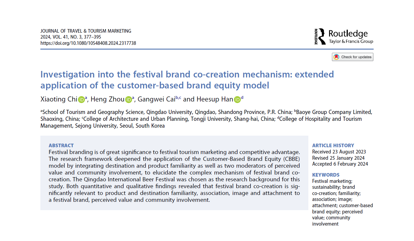 “Investigation into the festival brand co-creation mechanism: extended application of the customer-based brand equity model”一文指出,节庆品牌建设对节庆旅游营销和竞争优势至关重要。本研究深化了基于顾客的品牌资产(CBBE)模型的应用,以青岛国际啤酒节为研究背景,整合了目的地和产品熟悉度以及感知价值和社区参与两个调节变量,阐明了节庆品牌共创的复杂机制。研究结果表明,节庆品牌共创与产品和目的地熟悉度、节庆品牌的联想、形象和依恋、感知价值和社区参与息息相关。本研究为提升节庆品牌运营和发展提供了重要的理论和管理启示。