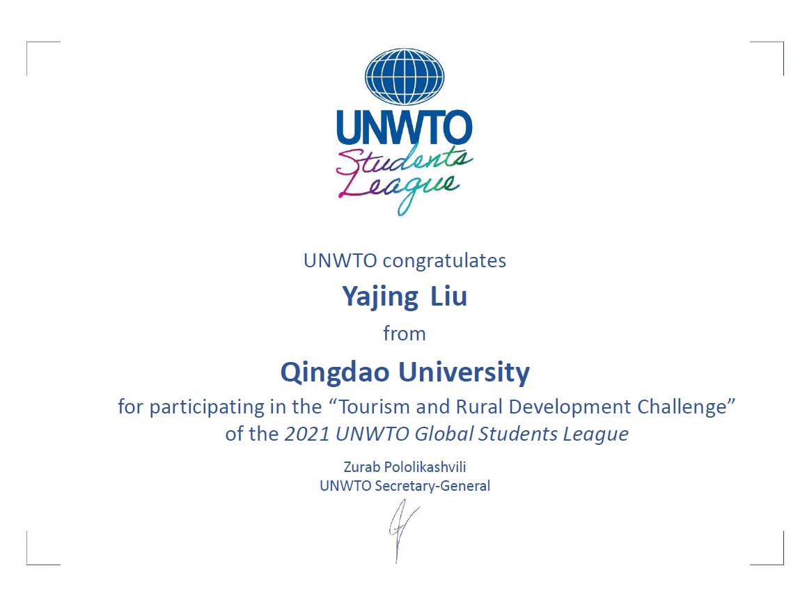 2021年7月,第二届世界旅游组织学生联盟挑战赛(UNWTO Student's League Competition 2021)落下了帷幕。我院积极参与世界旅游组织学生联盟挑战赛,代表SJB世俱杯官方网站顺利入围乡村旅游发展(Rural Development through Tourism Challenge)本科生组专项赛道,此赛道共有来自中国、美国、英国、德国、俄罗斯等31个国家的65所院校参赛,其中中国赛区共有16所院校入围,包括SJB世俱杯官方网站、厦门大学、山东大学、首都师范大学、北京林业大学、华侨大学、澳门旅游学院等知名院校。我院团队取得中国区排名第3位,全球排名第14位的优异成绩。