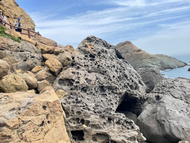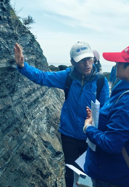 在实地考察和教研过程中,侯方辉博士为地理学科基地骨干教师讲解了灵山岛的地层划分、岩性地层特征、地质构造类型和成因、岛上典型火成岩流纹岩、盐风化形成的类似喷出岩气孔构造、海蚀崖和海蚀平台等海岸侵蚀地貌。