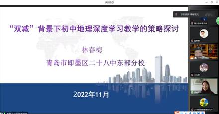 青岛市即墨区第二十八中学东部分校高级教师林春梅是即墨区师德建设先进个人、即墨区教学能手、即墨区初中教育质量优胜个人和优胜备课组长的多次获得者;即墨区优质课一等奖,出示青岛市名师开放课,并在“第二届青岛市中小学信息技术创新与实践活动”中荣获初中组一等奖,是一位优秀的地理名师。林老师的讲座题目是“双减”背景下初中地理深度学习教学的策略探讨,从“充分挖掘教材,实施地理深度教学、充分创设情景,激发学生参与兴趣、方法引路入境,掌握地理综合思维、走进学生生活,践行地理实践力、实施分层教学,全面提高教学质量”5方面解读。