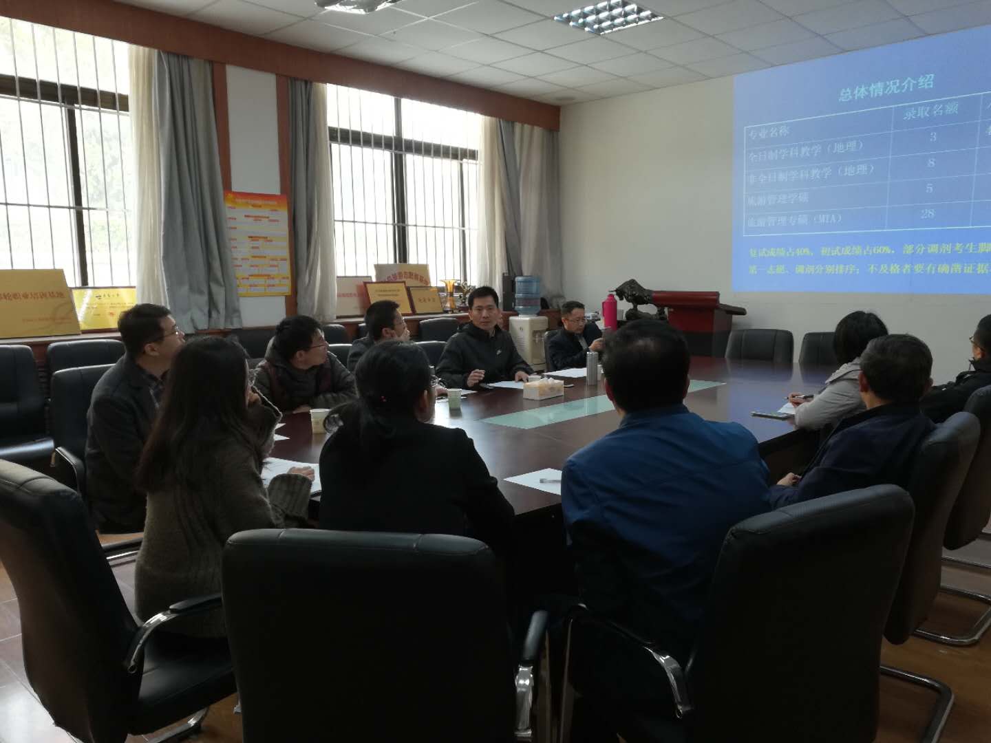 2019年3月28日,根据学校统一部署和要求,我院开展了2019年旅游管理学术硕士、旅游管理专业硕士(MTA)和学科教学(地理)共三个学科专业的研究生招生复试工作。为保证本次工作的顺利进行,学院专门成立了由院长、书记、学术委员会主席等组成的研究生招生复试工作小组,成立了三个学科专业复试小组,组织开展了2019年研究生招生复试工作培训会。在前期周密部署和认真准备的基础上,经过一天紧张而有序的工作,此次研究生招生复试工作圆满结束。